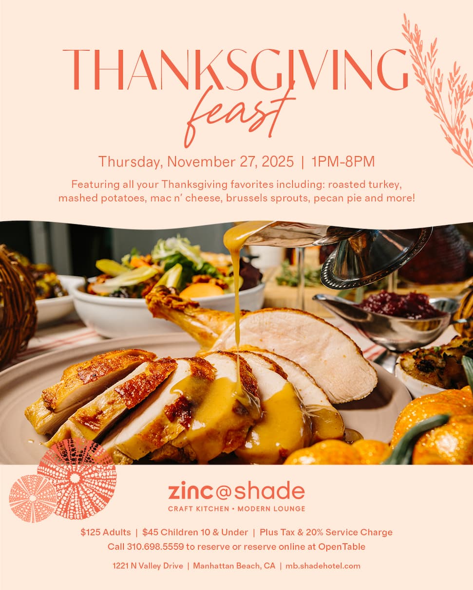 Join us in Manhattan Beach for a festive buffet at zinc@shade available on November 27th from 1 to 8 PM. Enjoy all your traditional holiday favorites with an elevated twist in the beautiful downtown Manhattan Beach! Lock in your experience on OpenTable or call us at 310-698-5559 for inquiries or reservations and look forward to … Continue reading “Thanksgiving Feast in Manhattan Beach”