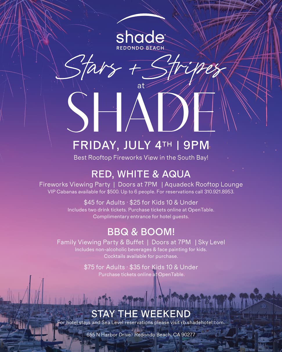 Experience the Best Rooftop Firework View in the South Bay! For $45 general admission, you can reserve a front-row seat to South Bay’s most spectacular firework show on our Aquadeck with sweeping ocean views and craft drinks! Each ticket includes entry to the rooftop lounge and two drink tickets. Doors open at 7 PM | … Continue reading “Stars and Stripes at Shade Hotel Redondo Beach”