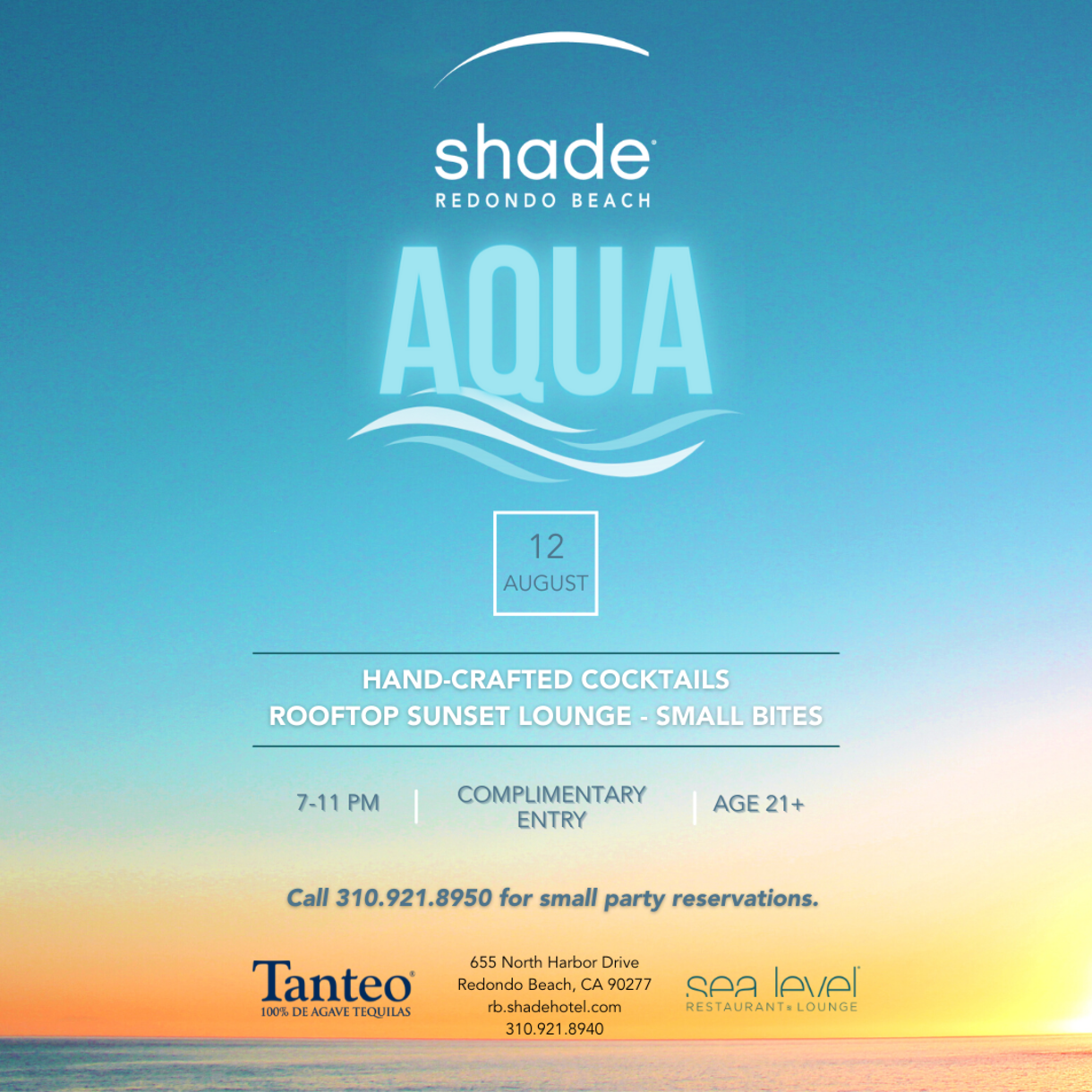 AQUA @ Shade Hotel Redondo Beach Sunset cocktails, DJ, small bites & the only oceanfront rooftop deck in the South Bay! Join us on Friday, August 12th from 7-11 PM for the perfect South Bay Summer night. Complimentary entry | Open Seating | Ages 21+ Please call 310.921.8940 for large party reservations. LEARN MORE