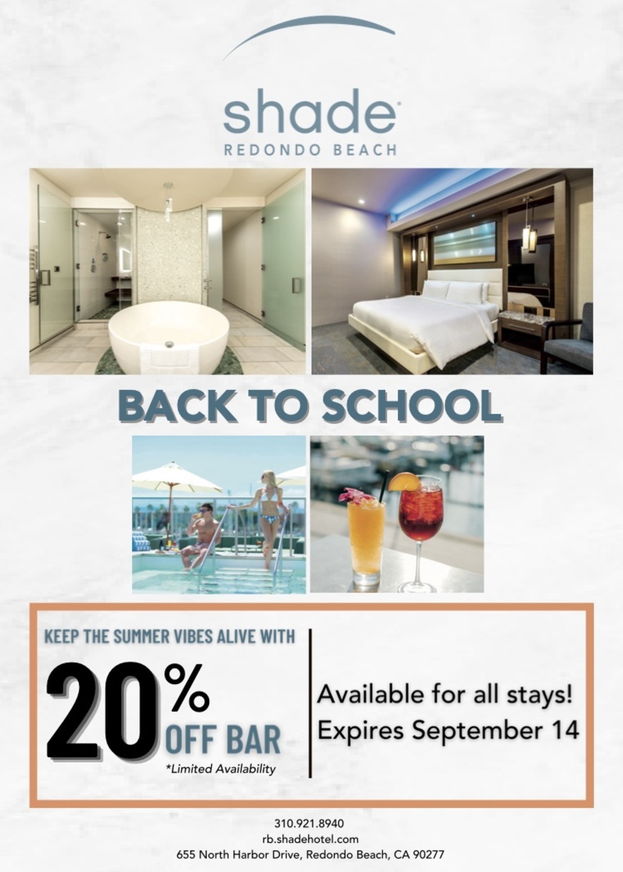 Back to School Special School is back in session, but that doesn’t mean your Summer plans must halt! Stay in ANY room at Shade Hotel Redondo Beach between August & September 14th to enjoy a vacation at our waterfront luxury boutique hotel at 20% off our best available rates. *Limited Availability Reserve your coastal getaway … Continue reading “Keep Summer Vibes Alive At Shade Redondo Beach!”