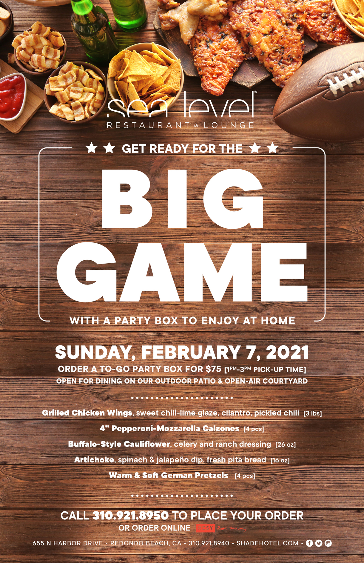 Get ready for the big game with a party box to enjoy at home from Sea Level Restaurant at Shade Hotel Redondo Beach. Order a To-Go Party Box for $75 to be picked up between 1pm and 3pm on Sunday, February 7, 2021. BIG GAME OFFERINGS Grilled Chicken Wings, Pepperoni-Mozzarella Calzones, Buffalo- Style Cauliflower, Artichoke, … Continue reading “Shade Hotel Redondo Beach Offering a Big Game To-Go Package”