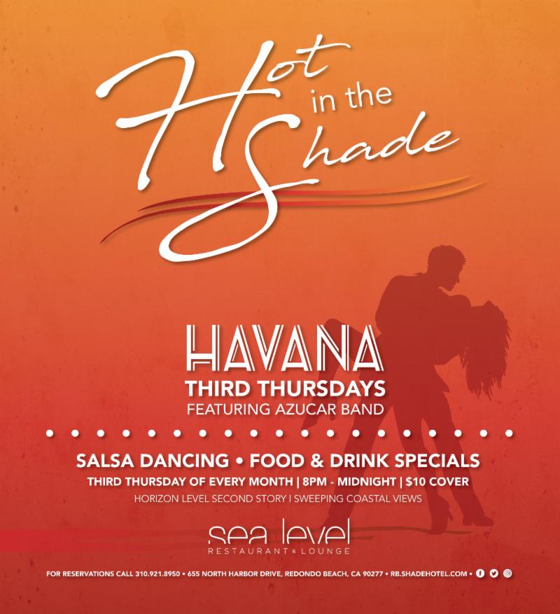 Hot in the Shade! FIRST TWO EVENTS (APRIL 19TH & MAY 17TH) WILL HAVE NO COVER CHARGE Join us every third Thursday of the month for Salsa Dancing and Live Music on our second story Horizon Level with sweeping coastal views. AZUCAR band will be performing with high energy beats and will also have salsa … Continue reading “It’s Hot in the Shade at Shade Hotel Redondo Beach”